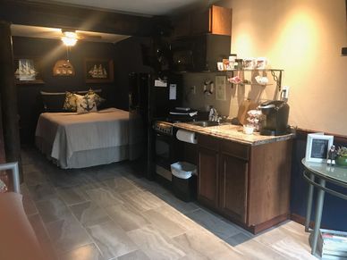 Set sail with the Captain! This Suite is set-up to inspire your sea legs and make you feel like the Captain of your own ship. The room surrounds you with authentic nautical decor, beautiful unique sailing pieces and authentic treasure maps. It is painted a deep midnight blue and is perfect for day sleeping. With the plush queen sized bed, luxury linens and its own flat screen TV you will feel like you are sleeping under the stars. The Living room area offers a full size couch/trundle bed for lounging or to sleep an extra guest and a twin trundle pull out bed underneath for an additional guest or child. It's a great area for relaxing and reading or watching the 2nd flat screen TV. The Kitchenette is stocked with pans, dishes, and utensils and includes a Coffee Maker, oven, microwave and full size fridge. Your private bathroom has a large 2 person shower, separate toilet room, plush towels and just enough room to not feel crowded. A Rollaway bed can be added making this room sleep 5.