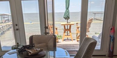The "Bay Room" overlooks Galveston Bay and the Kemah Boardwalk. This room is a 565 square foot suite which includes a lush King size bed, a queen size convertible sofa, and large dining/gaming area that seats four. You can actually be in bed and watch the water at the same time! This suite is ultra-relaxing and offers a large private bathroom with bathtub/shower, large deck on the water, and a private entrance and it is the closest unit to pier and guest spa.
