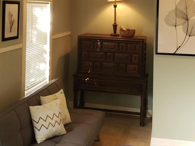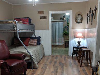 Being Texans (proudly born and raised), we always wanted to do a Texas themed room to show off some of our heritage, and so The Tejas cottage was born! Everything in this room is over sized with a big Texan personality. As you enter, you will find 2 large leather recliners, a Queen size memory foam mattress under twin bunk set and huge lounging pillows. To your right is a separate Bedroom with a Queen memory foam mattress with plush linens and a cow skin (vegan :)) rug as a head board. There is a large kitchen and dining/gaming table with four leather chairs and a built in desk original to this unit from the 1940's. Full size fridge, microwave, all pots/pans/utensils and coffee maker/coffee/tea is provided. The bathroom is this unit is a bit small but the rest of the room makes up for it. Feel free to ask for pictures. The room layout flows really well and you will love checking out the authentic vintage decor and tools. There is a small private deck for this room but all guests are encouraged to enjoy all of our outdoor areas and palapas, The large above-ground Pool and Spa are located near the waterfront and available for your use as well. Outdoor Grills are provided and we have a variety depending on your cooking preference.