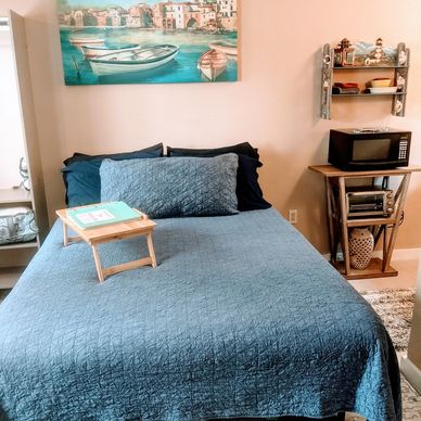 This Suite has a large separate bedroom with a plush Queen size bed and linens. There is a flat screen TV in the bedroom with a closet and armoire. The living area is perfect for relaxing and reading or watching the 2nd flat screen TV. The Kitchen in this unit is full size with a large fridge and is stocked with pans, dishes, and utensils and includes a Full size Coffee Maker, coffee, and various sugars and creamers. Your private bathroom has a walk-in shower, plush towels and just enough room to spread out and relax. In the Living Room you will find a couch that becomes a full size sleeper. A Rollaway bed can be added, making this room sleep 5. There is a binder in your room where we provide a map to nearby restaurants and attractions, coupons and additional information for your convenience. There is a private deck for this room but all guests are encouraged to enjoy all of our outdoor areas and palapas, The large above-ground Pool and Spa are located near the waterfront and available for your use. Outdoor Grills are provided and we have a variety depending on your cooking preference.